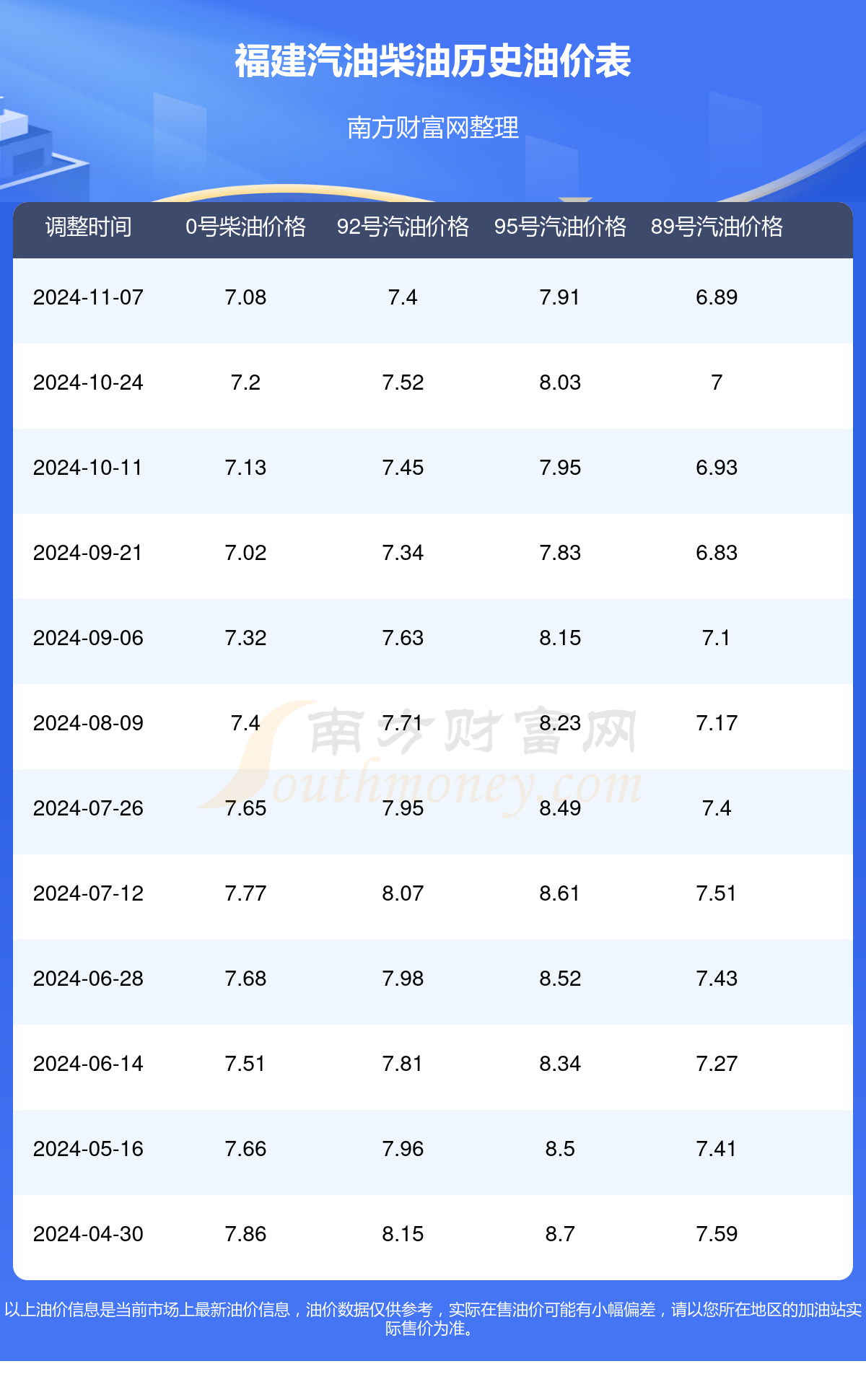 福建汽油、柴油11月25日每升最新价格为:调整时间为11月7日,92号汽油为7.4元,下降了0.12元;95号汽油为7.91元,下降了0.12元;89号汽油为6.89元,下降了0.11;0号柴油为7.08元,下降了0.12元。