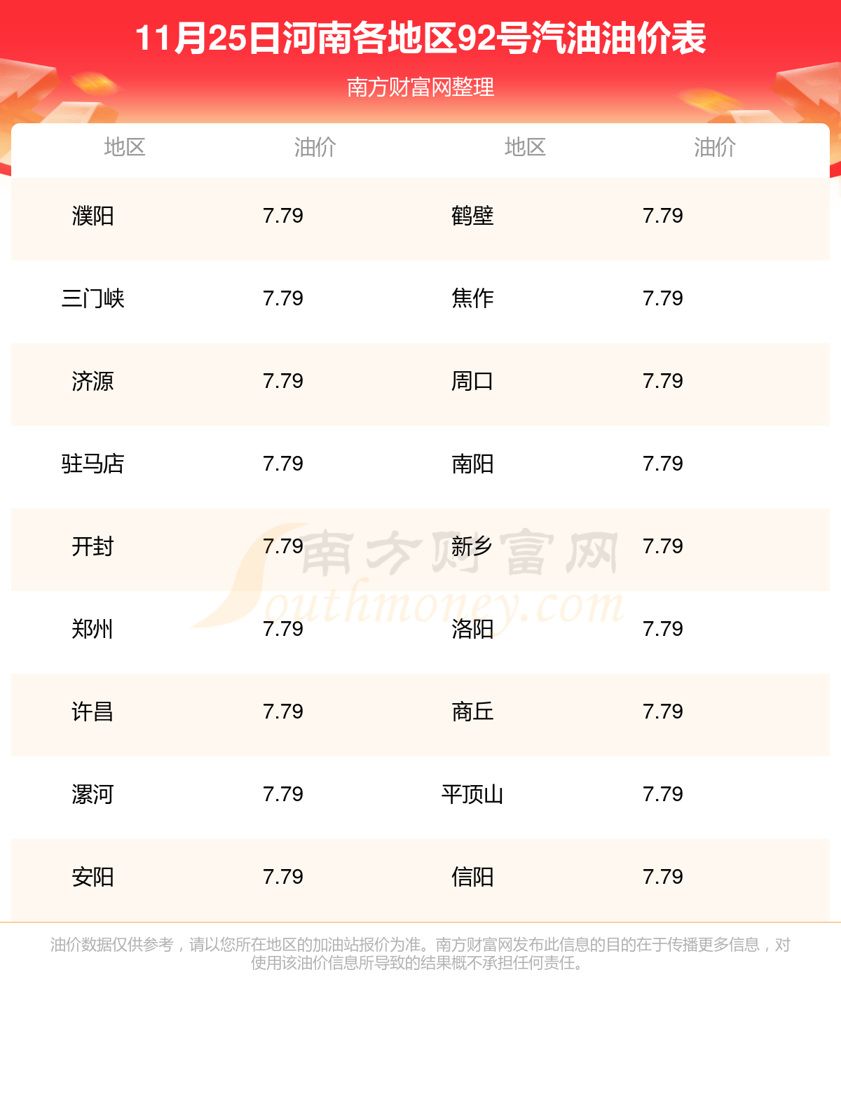 河南各地区最新92号汽油油价表