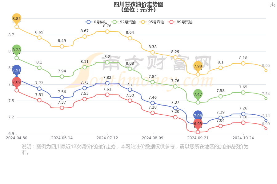 四川甘孜汽油、柴油11月25日价格多少钱一升?具体为:0号柴油为7.14元,减了0.12元;95号汽油为8.05元;92号汽油为7.54元;89号汽油为6.99元,调整时间为11月7日。