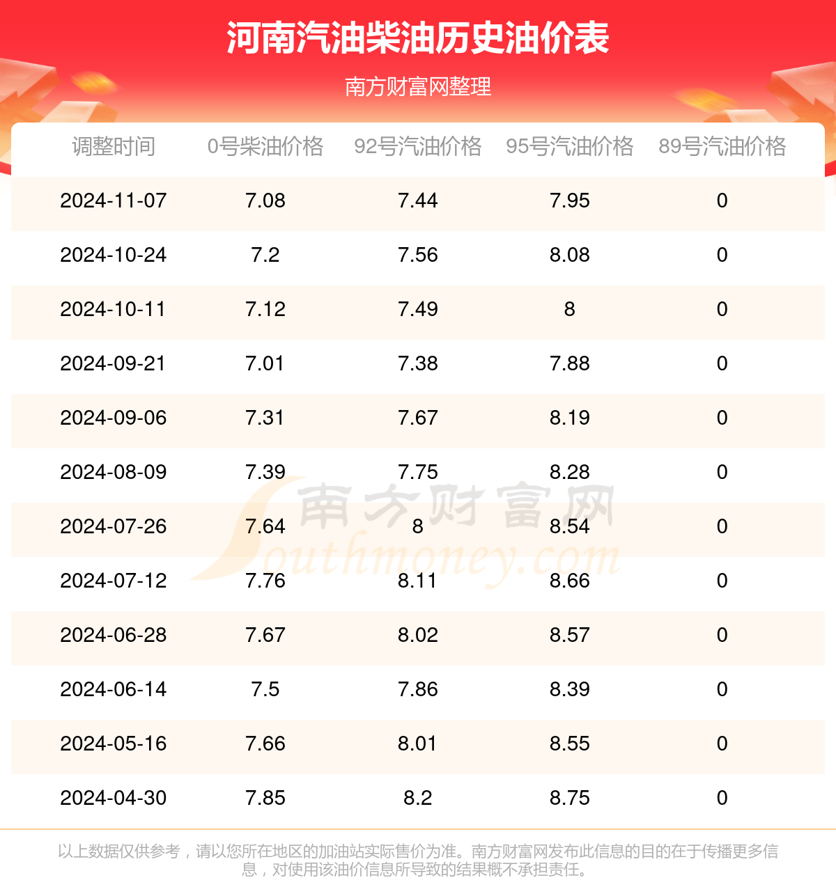 11月25日,河南汽油、柴油每升最新价格为:调整时间为11月7日,92号汽油为7.44元,降了0.12元,降幅达1.59%;95号汽油为7.95元,降了0.13元,降幅达1.61%;0号柴油为7.08元,降了0.12元,降幅达1.67%。