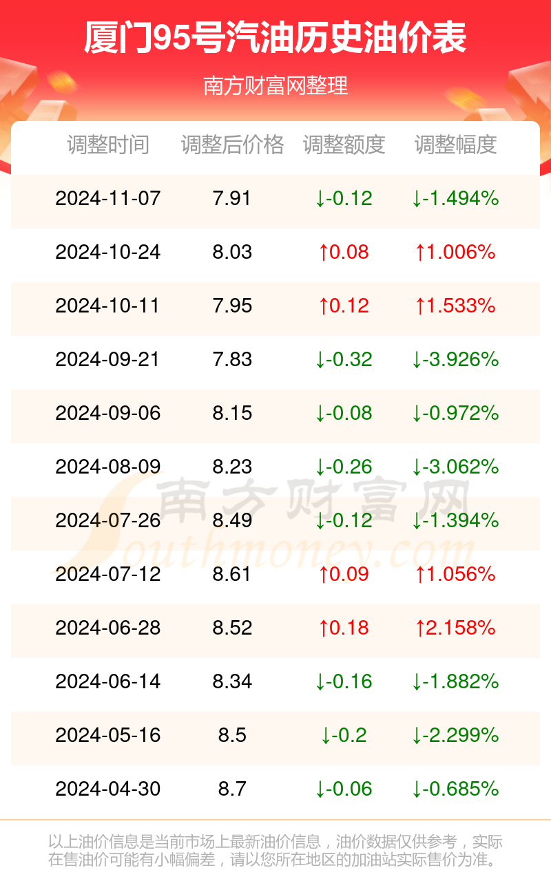11月25日厦门95号汽油的价格为7.91元/升,这是11月7日调整后的价格,对比上轮调整下调了0.12元,下调1.494%。