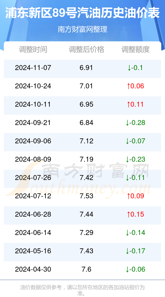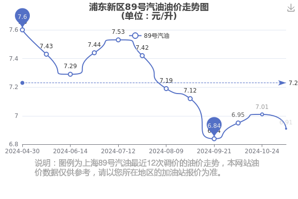 11月25日浦东新区89号汽油的价格为6.91元/升,本轮油价的调整时间为11月7日,相对上一轮油价调整时间10月24日的价格7.01元/升,减了0.1元,减幅达1.427%。