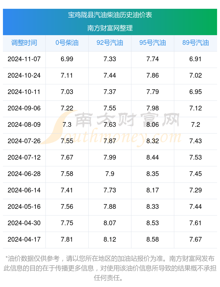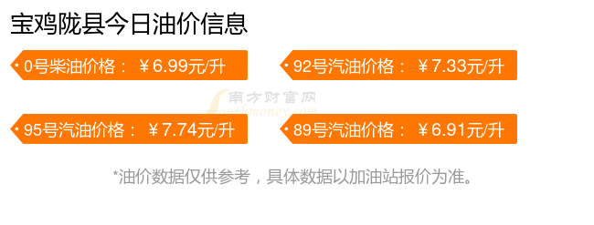 11月25日,宝鸡陇县汽油、柴油每升的价格为11月7日调整后的价格,具体为:92号汽油为7.33元,降了0.11元,降幅达1.48%;95号汽油为7.74元,降了0.12元,降幅达1.53%;89号汽油为6.91元,降了0.11元,降幅达1.57%;0号柴油为6.99元,降了0.12元,降幅达1.69%。