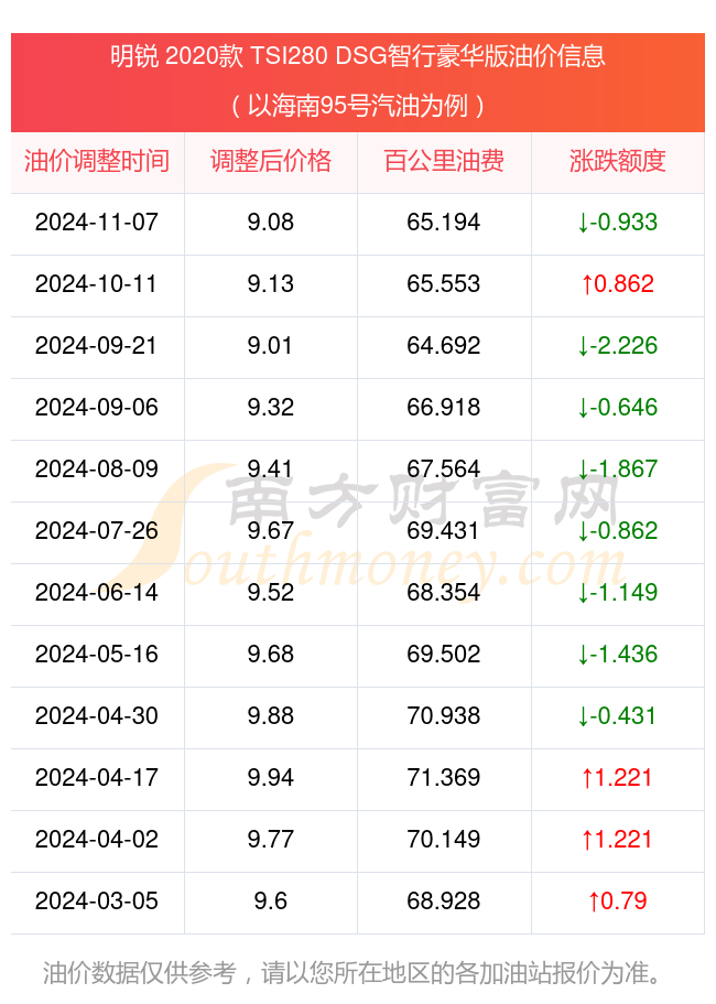 按照11月7日95号汽油最新调整价格9.08元/升来计算(以海南为例),该车型百公里平均油费为65.194元,按照上一轮10月11日调整价格9.21元/升来计算,百公里平均油费为66.128元,对比上一轮少花0.933元,下一轮油价调整时间为12月2日24时。