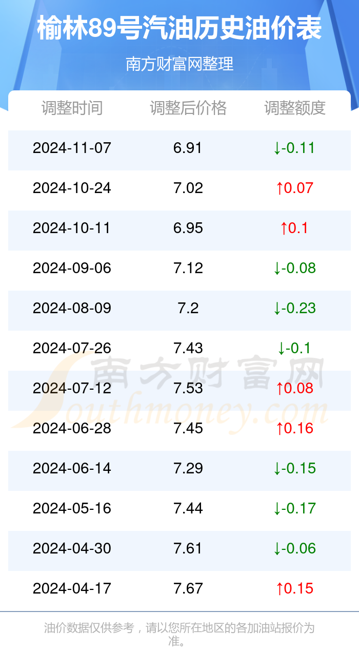 11月25日榆林89号汽油的价格是6.91元/升,油价于11月7日调整,相对上次调整时间10月24日的油价7.02元每升,共下调了0.11元,下调幅达1.567%。