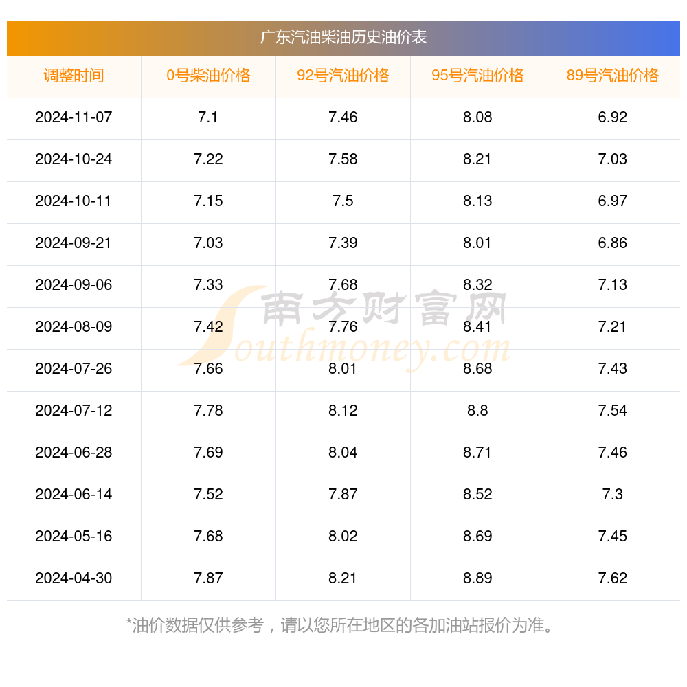 11月25日,广东汽油、柴油每升最新价格为:调整时间为11月7日,92号汽油为7.46元,下降了0.12元,下降幅达1.58%;95号汽油为8.08元,下降了0.13元,下降幅达1.58%;89号汽油为6.92元,下降了0.11元,下降幅达1.57%;0号柴油为7.1元,下降了0.12元,下降幅达1.66%。