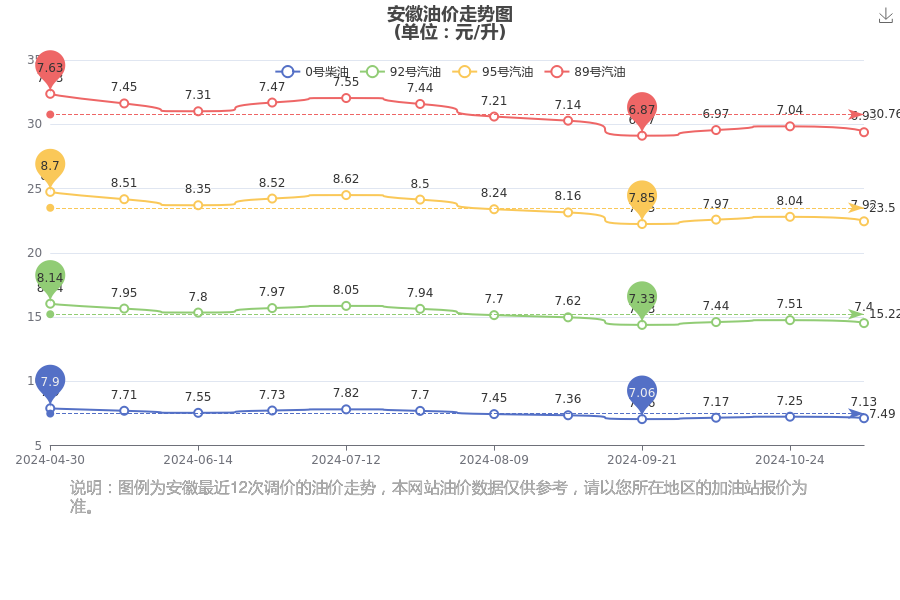 11月25日安徽汽油、柴油每升的价格具体为:本轮油价调整时间为11月7日,92号汽油是7.4元,下降了0.11元,下降幅达1.47%;95号汽油是7.92元,下降了0.12元,下降幅达1.49%;89号汽油为6.93元,下降了0.11元,下降幅达1.56%;0号柴油为7.13元,下降了0.12元,下降幅达1.66%。