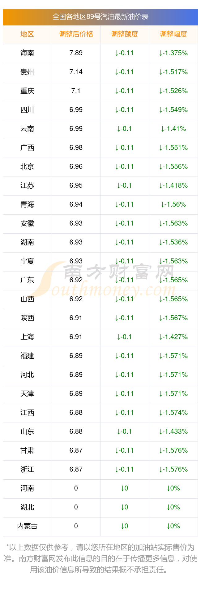11月25日全国89号汽油最新平均价格为7元每升(本次油价格调整时间11月7日),其中,全国89号汽油最低为浙江,价格6.87元/升,89号汽油最高为海南,价格7.89元/升。