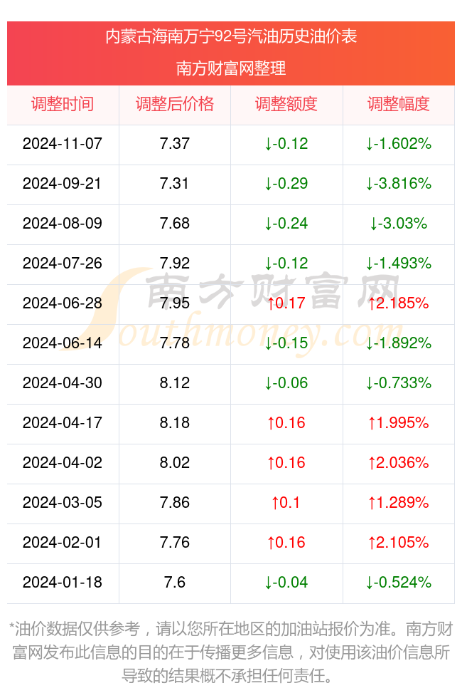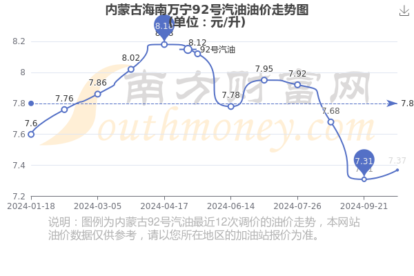 内蒙古海南万宁92号汽油11月25日最新价格为7.37元/升,为11月7日油价调整后的价格,相对上次调整时间9月21日的油价7.49元每升,降了0.12元,降1.602%。