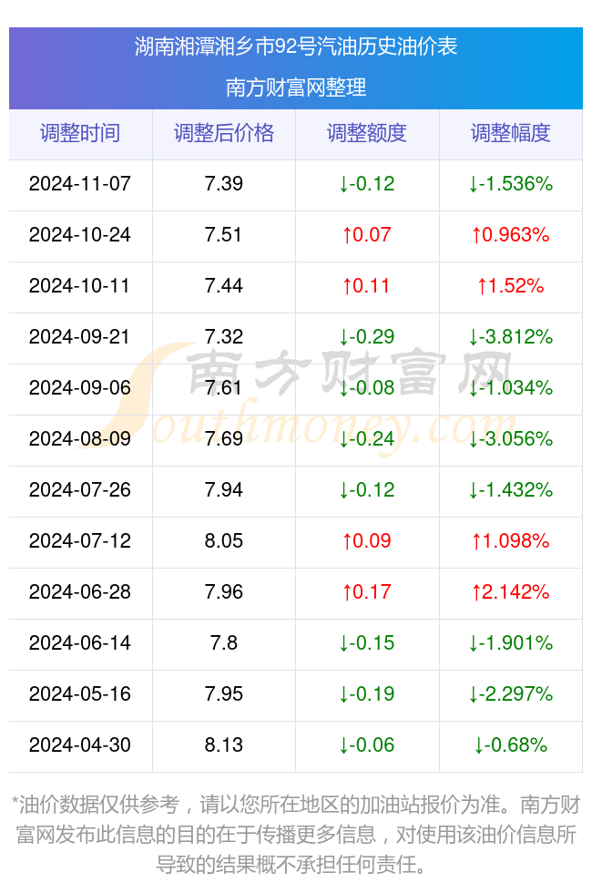 11月25日湖南湘潭湘乡市92号汽油价格查询:每升7.39元(11月7日油价调整后的价格),相对上次调整时间10月24日的油价7.51元每升,下调了0.12元,下调1.536%。