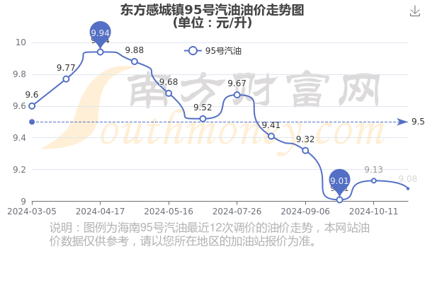 东方感城镇95号汽油11月25日最新价格为9.08元每升,本轮油价调整时间为11月7日,相对上次调整时间10月11日的油价9.21元每升,共减了0.13元,减1.412%。