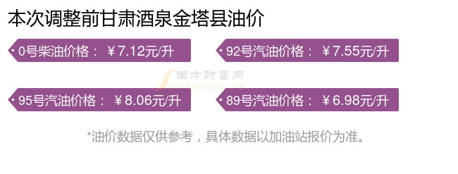 11月25日,甘肃酒泉金塔县汽油、柴油每升的价格是多少?本次油价调整时间是11月7日,92号汽油为7.44元,下调了0.11元,下调幅达1.46%;95号汽油为7.94元,下调了0.12元,下调幅达1.49%;89号汽油为6.87元,下调了0.11元,下调幅达1.58%;0号柴油为7元,下调了0.12元,下调幅达1.69%。