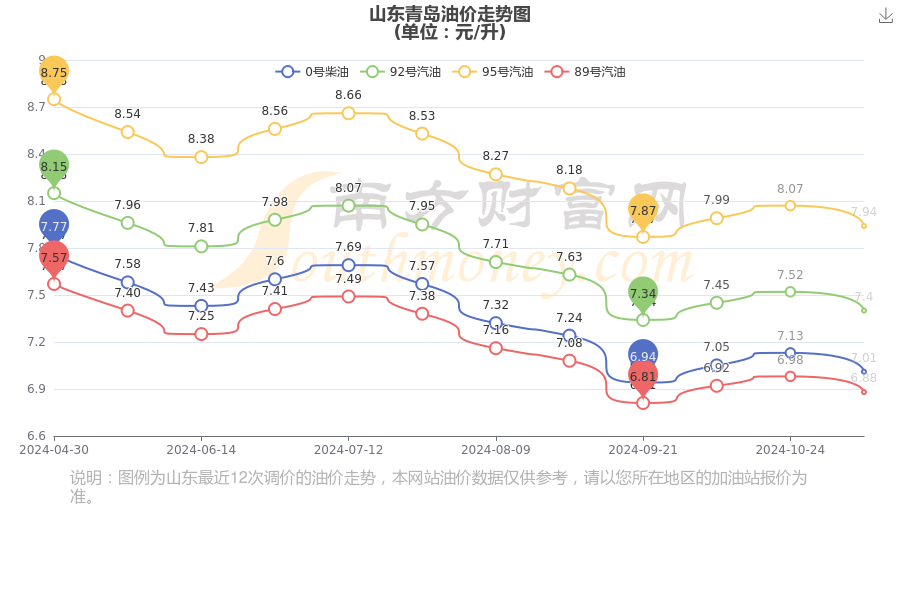 山东青岛汽油、柴油11月25日每升的价格是多少?11月7日调整后的价格详情如下:92号汽油7.4元;95号汽油7.94元;89号汽油6.88元;0号柴油7.01元。