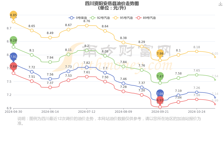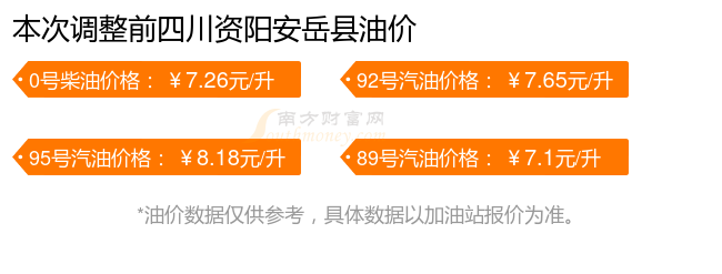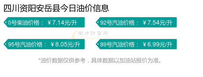 11月25日,四川资阳安岳县汽油、柴油每升最新价格为(11月7日调整后的价格):92号汽油为7.54元,下跌了0.11元,下跌幅达1.44%;95号汽油为8.05元,下跌了0.13元,下跌幅达1.59%;89号汽油为6.99元,下跌了0.11元,下跌幅达1.55%;0号柴油为7.14元,下跌了0.12元,下跌幅达1.65%。