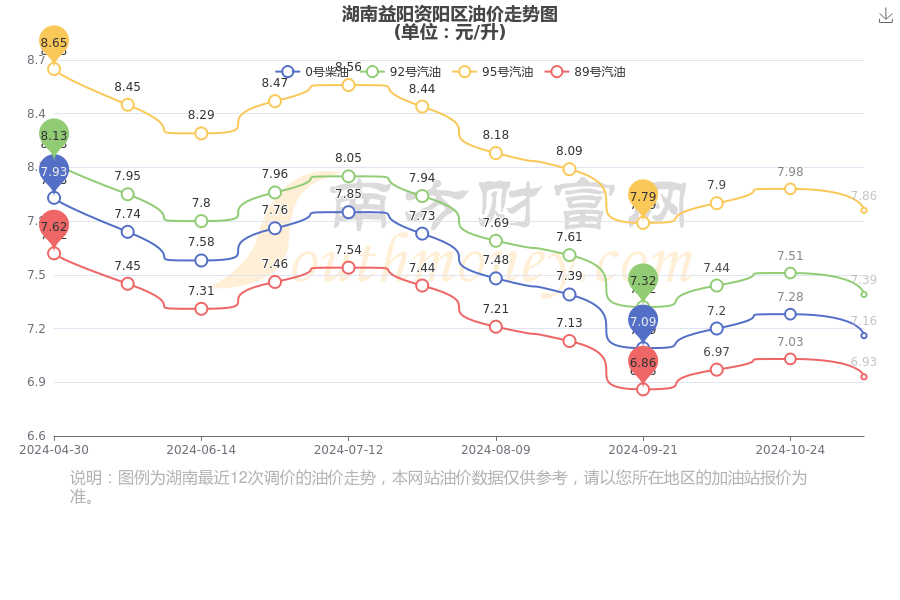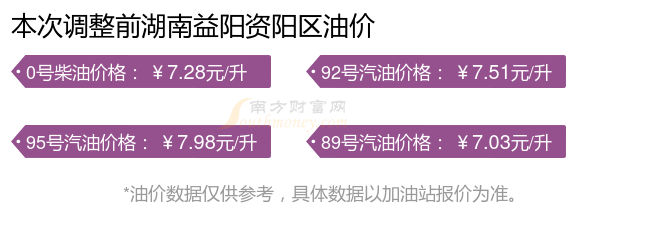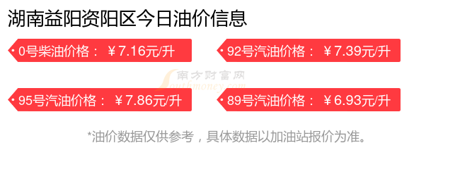 11月25日,湖南益阳资阳区汽油、柴油每升的价格为11月7日调整后的价格,具体为:92号汽油为7.39元,降了0.12元,降幅达1.54%;95号汽油为7.86元,降了0.12元,降幅达1.54%;89号汽油为6.93元,降了0.11元,降幅达1.54%;0号柴油为7.16元,降了0.12元,降幅达1.66%。
