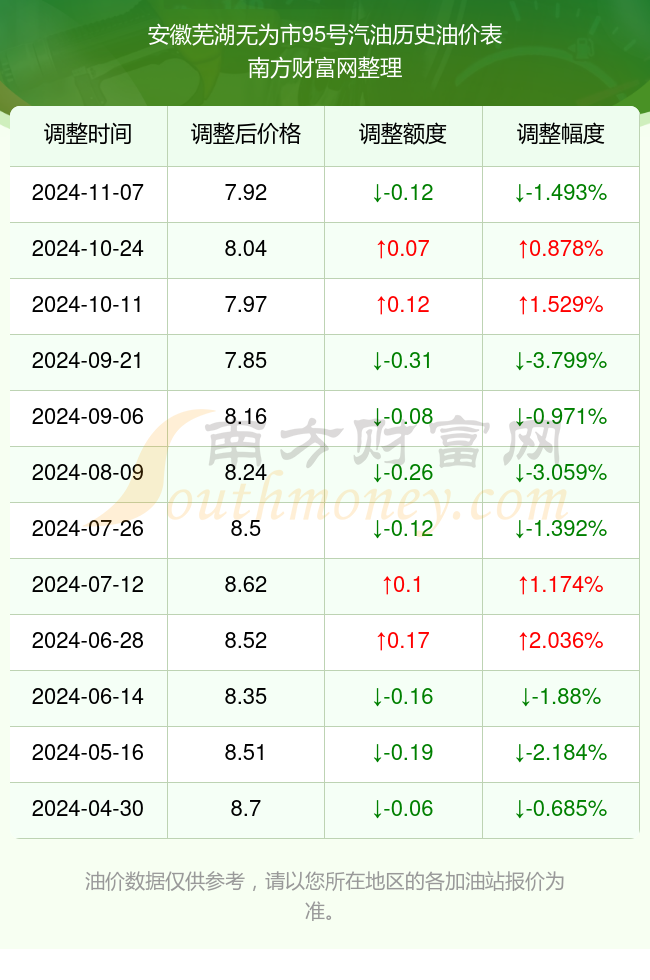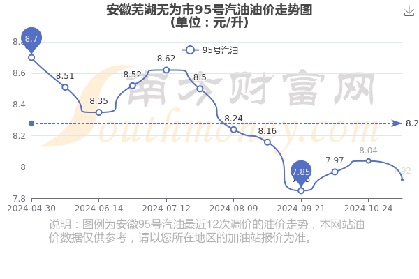 安徽芜湖无为市95号汽油11月25日的价格为每升7.92元,本次油价的调整时间11月7日,对比上次油价调整时间10月24日的价格8.04元/升,共下降了0.12元,下降幅达1.493%。
