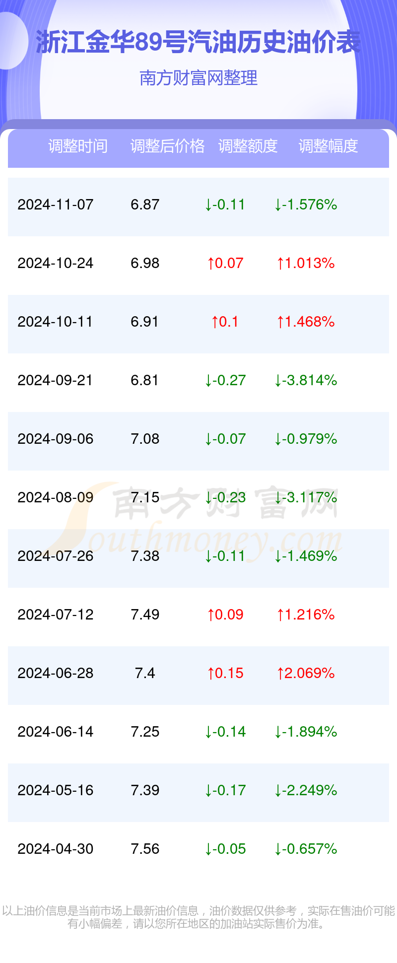 11月25日浙江金华89号汽油的价格是6.87元/升(调整时间为11月7日),对比上次调整时间10月24日的油价6.98元/升,下跌了0.11元,下跌幅达1.576%。