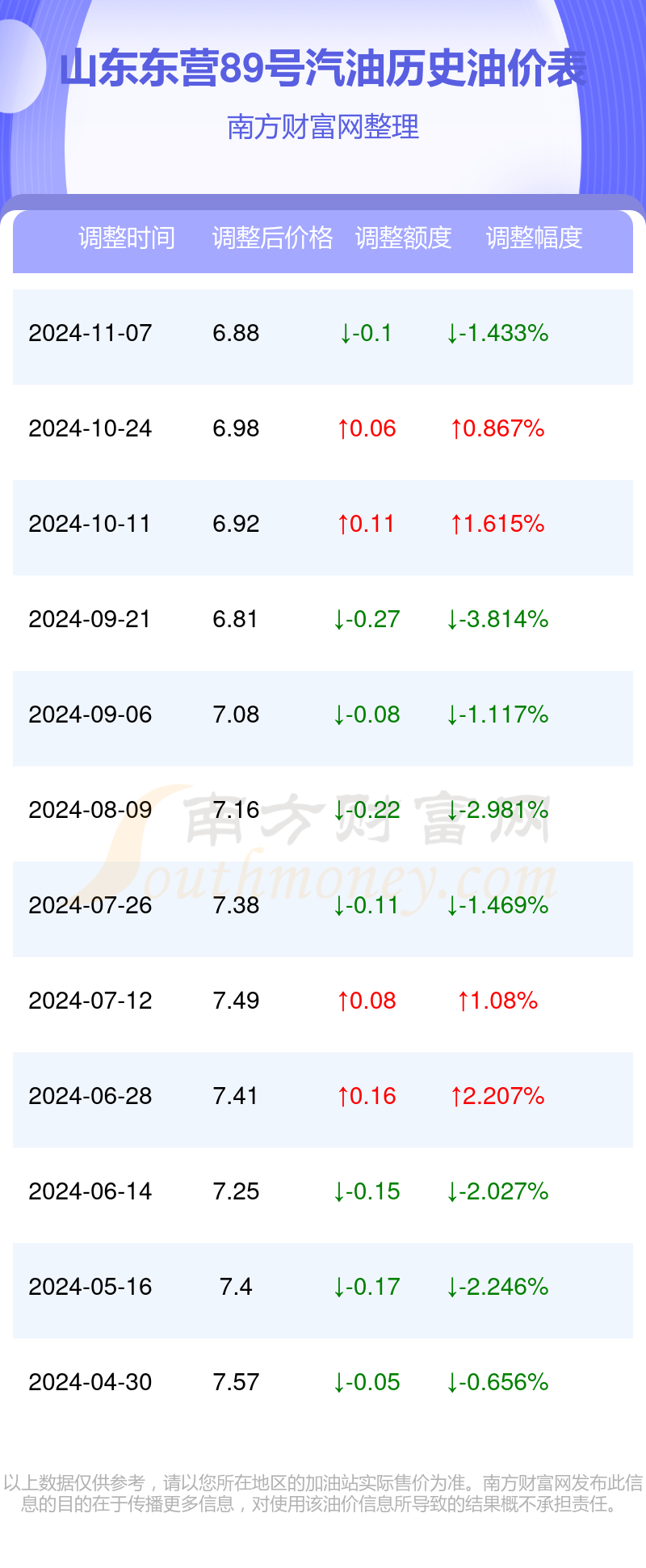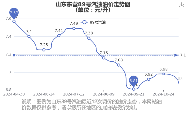 11月25日,山东东营89号汽油最新价格为6.88元/升,调整时间为11月7日,相对上次调整降了0.1元。
