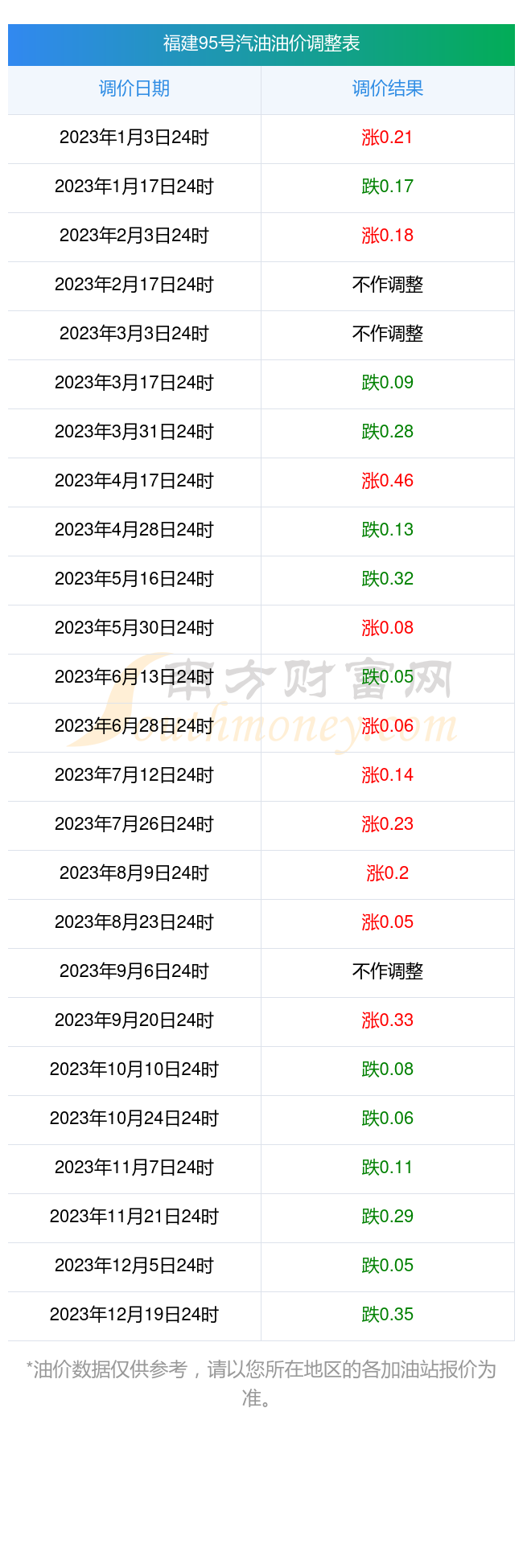 11月25日福建95号汽油最新油价是7.91元/升,本轮调整时间为11月7日,相对上一轮调整时间10月24日的油价8.03元/升,下调了0.12元。