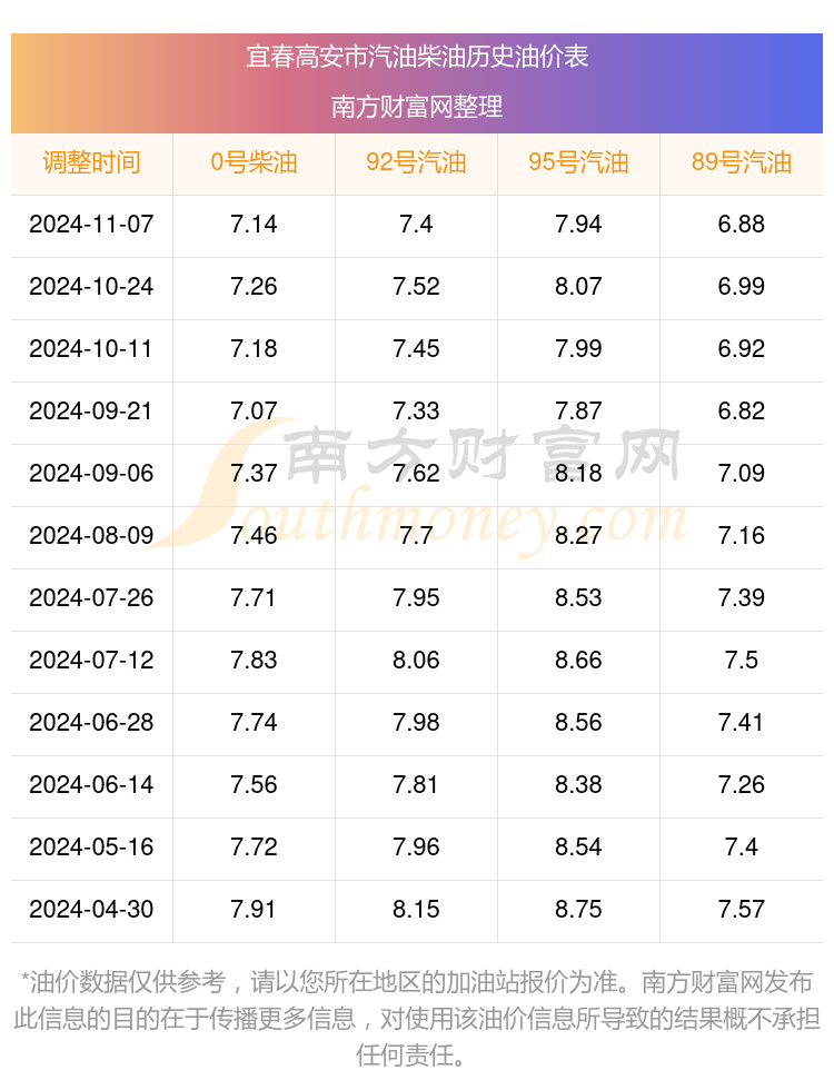 宜春高安市历史油价表