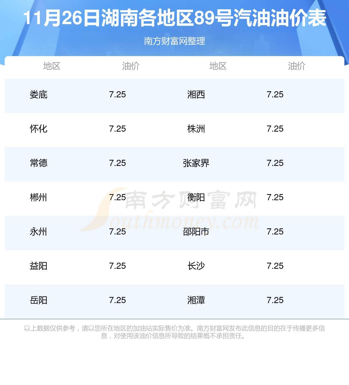 11月26日,湖南89号汽油的最新价格为6.93元/升,本轮油价调整时间是11月7日,对比上次调整共下降了0.11元,下降1.536%。
