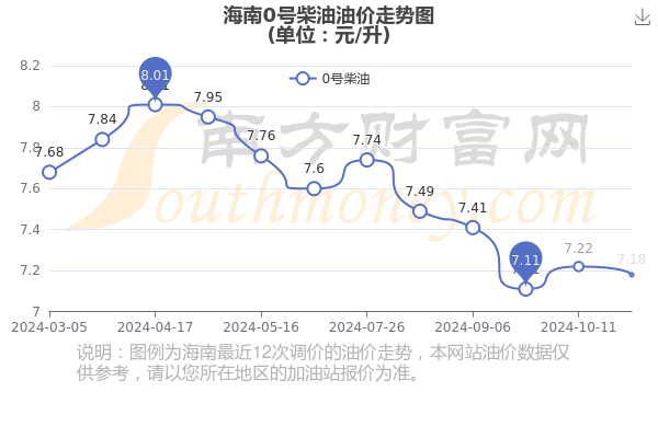 11月26日海南0号柴油价格为7.18元/升,调整时间为11月7日,相对上次调整时间10月11日的油价7.3元/升,跌了0.12元。