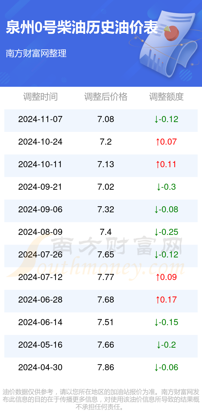 11月26日泉州0号柴油价格查询:每升7.08元(11月7日油价调整后的价格),相对上次调整时间10月24日的油价7.2元每升,下降了0.12元,下降1.667%。