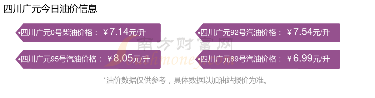 四川广元汽油柴油11月26日的价格每升多少钱?具体为:92号汽油为7.54元,跌了0.11元;95号汽油为8.05元,跌了0.13元;89号汽油为6.99元,跌了0.11元;0号柴油为7.14元,跌了0.12元,本轮油价的调整时间为11月7日。