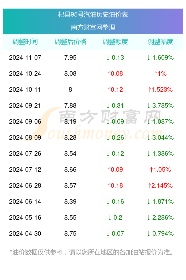 以上数据仅供参考,请以您所在地区的加油站实际售价为准。油价发布此信息的目的在于传播更多信息,对使用该油价信息所导致的结果概不承担责任。