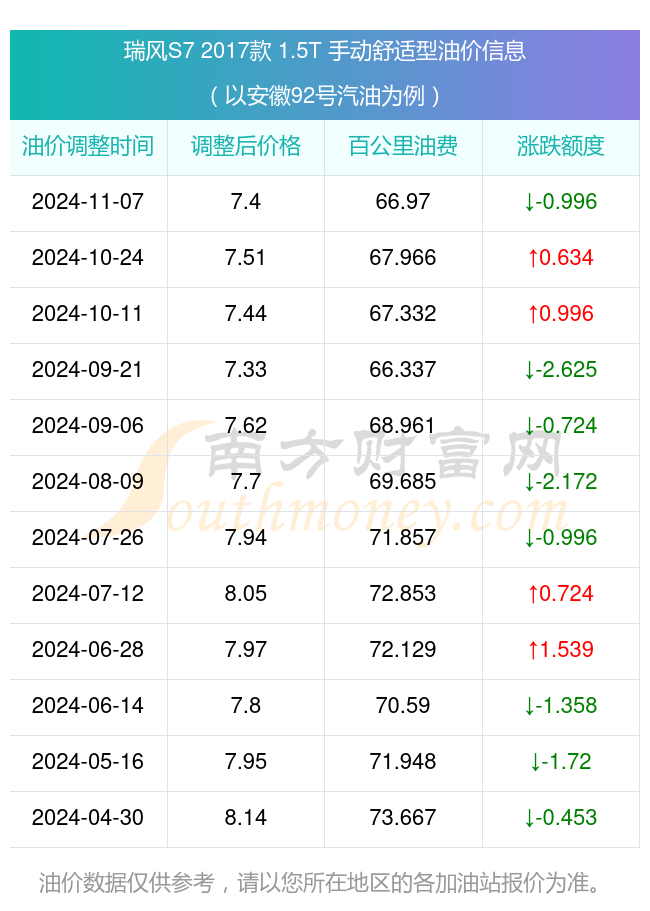 依照11月7日92号汽油最新调整价格7.4元/升来计算(以安徽为例),该车型百公里的平均油费是66.97元,依照上一轮10月24日调整价格7.51元/升来计算,百公里的平均油费是67.966元,对比上一轮少花0.996元,下一轮的油价调整时间12月2日24时。