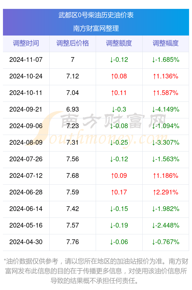 11月26日武都区0号柴油的价格为11月7日调整后的价格,具体为:7元每升,相对上次调整时间10月24日的油价7.12元每升,下降了0.12元,下降幅达1.685%。