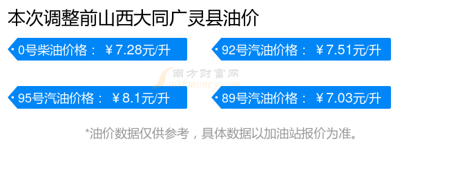 11月26日山西大同广灵县汽油、柴油每升的价格为:92号汽油为7.39元,下跌了0.12元;95号汽油为7.98元,下跌了0.12元;89号汽油为6.92元,下跌了0.11元;0号柴油为7.16元,下跌了0.12元,本轮油价的调整时间为11月7日。