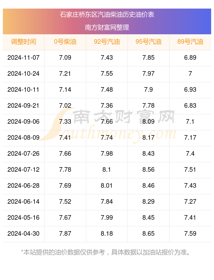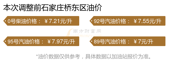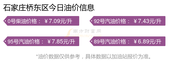 11月26日石家庄桥东区汽油、柴油的价格是11月7日调整后的价格,每升价格为:92号汽油为7.43元,下调了0.12元,下调幅达1.59%;95号汽油为7.85元,下调了0.12元,下调幅达1.51%;89号汽油为6.89元,下调了0.11元,下调幅达1.57%;0号柴油为7.09元,下调了0.12元,下调幅达1.66%。
