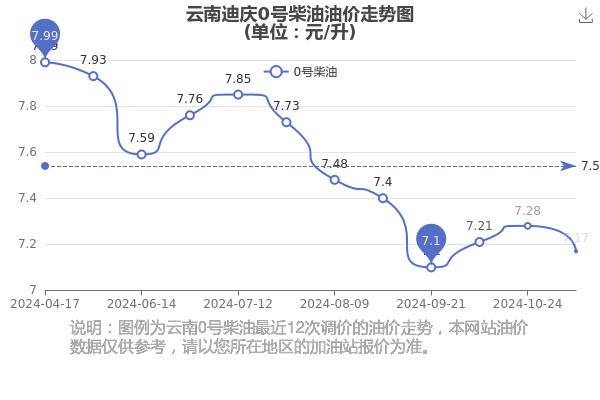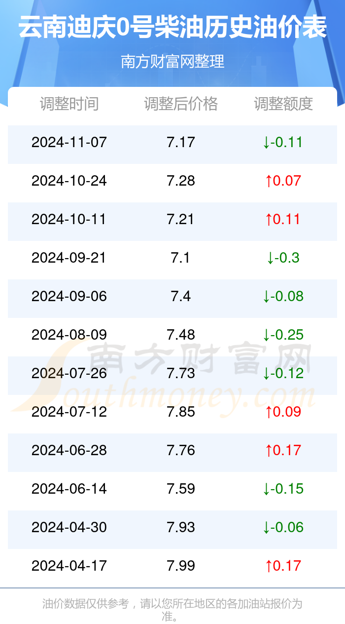 云南迪庆0号柴油11月26日价格(11月7日调整后的价格):7.17元每升,对比上次调整(10月24日)的价格7.28元每升下降了0.11元,下降幅达1.511%。