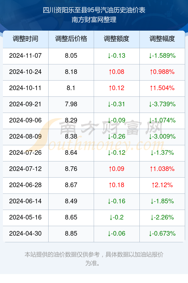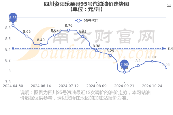 11月26日四川资阳乐至县95号汽油的价格是8.05元/升,油价于11月7日调整,相对上次调整时间10月24日的油价8.18元每升,共下调了0.13元,下调幅达1.589%。