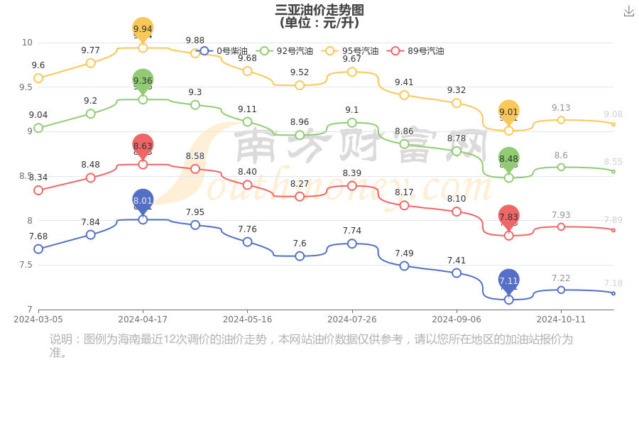 三亚汽油柴油11月26日的价格每升多少钱?具体为:92号汽油为8.55元,降了0.12元;95号汽油为9.08元,降了0.13元;89号汽油为7.89元,降了0.11元;0号柴油为7.18元,降了0.12元,本轮油价的调整时间为11月7日。
