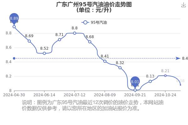 广东广州95号汽油11月26日的最新价格(11月7日油价调整后的价格):广东广州95号汽油8.08元/升,相对上次调整时间10月24日的油价8.21元每升,下降了0.13元,下降1.583%。