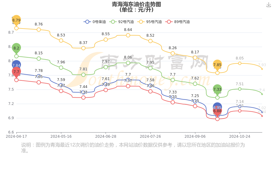 青海海东汽油、柴油11月26日每升的价格为(本轮油价调整时间为11月7日):92号汽油7.4元;95号汽油7.93元;89号汽油6.94元;0号柴油7.02元。