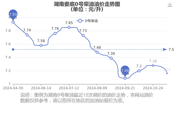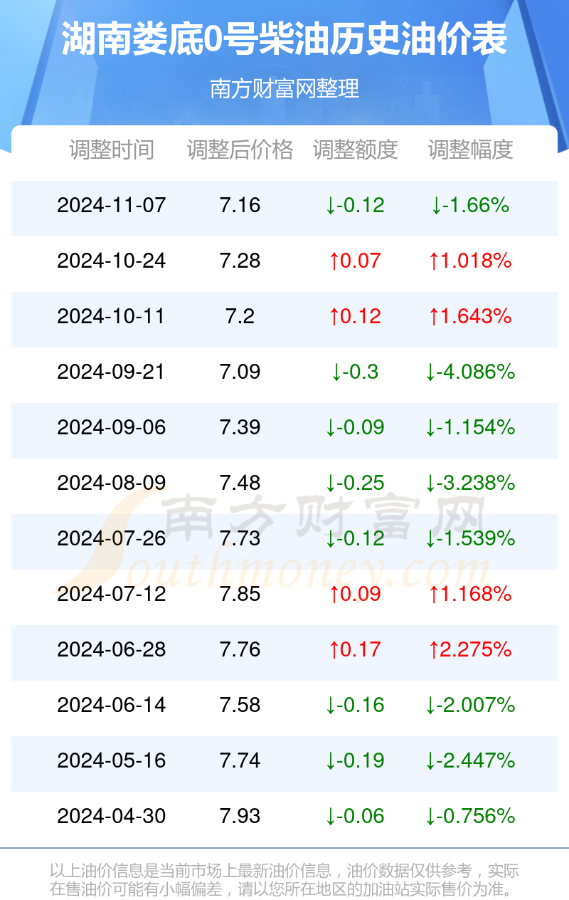 湖南娄底0号柴油11月26日的最新价格(11月7日油价调整后的价格):湖南娄底0号柴油7.16元/升,相对上次调整时间10月24日的油价7.28元每升,降了0.12元,降1.66%。