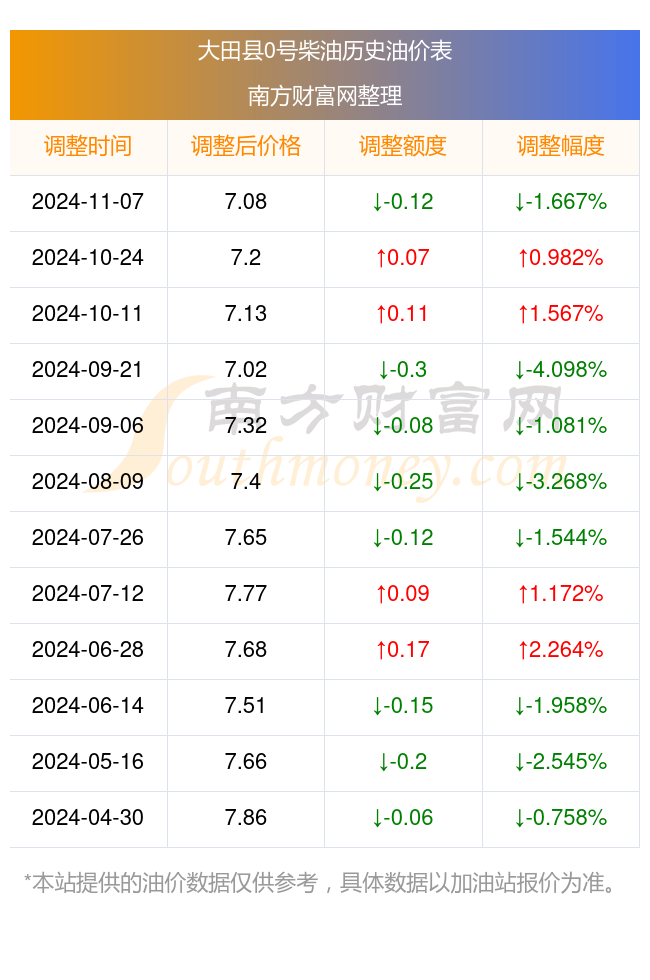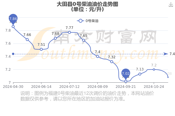 11月26日大田县0号柴油的价格为11月7日调整后的价格,具体为:7.08元每升,相对上次调整时间10月24日的油价7.2元每升,减了0.12元,减幅达1.667%。