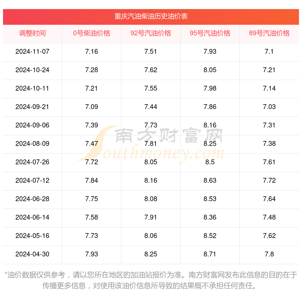 11月26日重庆汽油、柴油的最新价格是11月7日调整后的价格,具体为92号汽油7.51元,降了0.11元,降幅达1.44%;95号汽油7.93元,降了0.12元,降幅达1.49%;89号汽油7.1元,降了0.11元,降幅达1.53%;0号柴油7.16元,降了0.12元,降幅达1.65%。