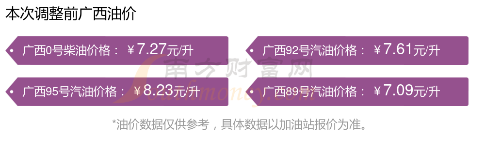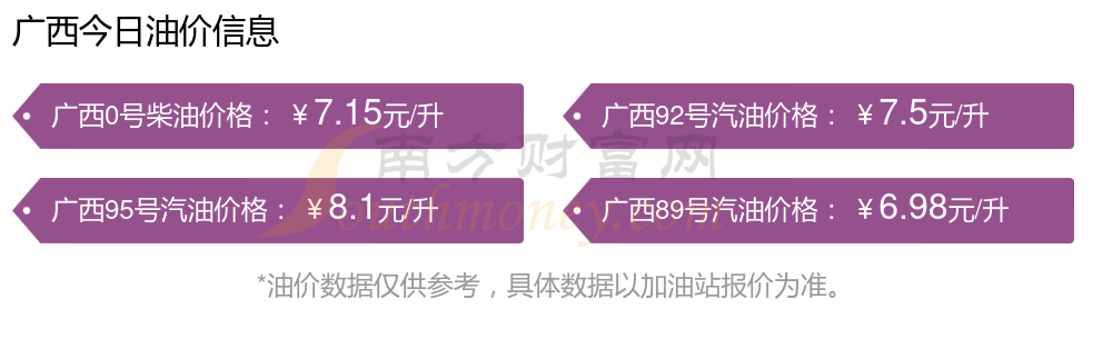 11月26日广西汽油、柴油每升的价格为11月7日调整后的价格,92号汽油为7.5元,减了0.11元,减幅达1.45%;95号汽油为8.1元,减了0.13元,减幅达1.58%;89号汽油为6.98元,减了0.11元,减幅达1.55%;0号柴油为7.15元,减了0.12元,减幅达1.65%。
