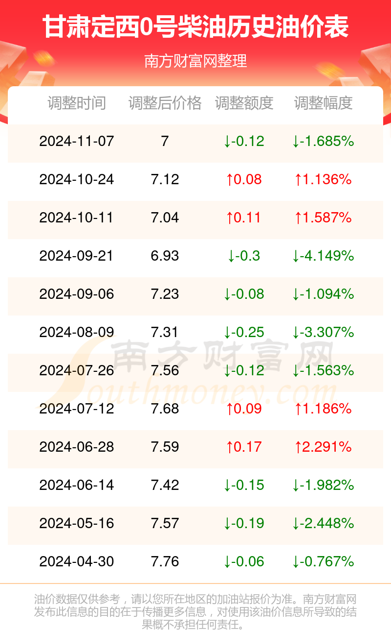 11月26日甘肃定西0号柴油的价格为7元/升,这是11月7日调整后的价格,对比上轮调整下跌了0.12元,下跌1.685%。