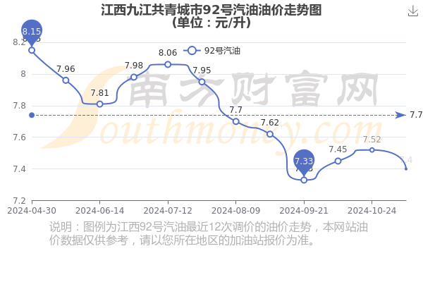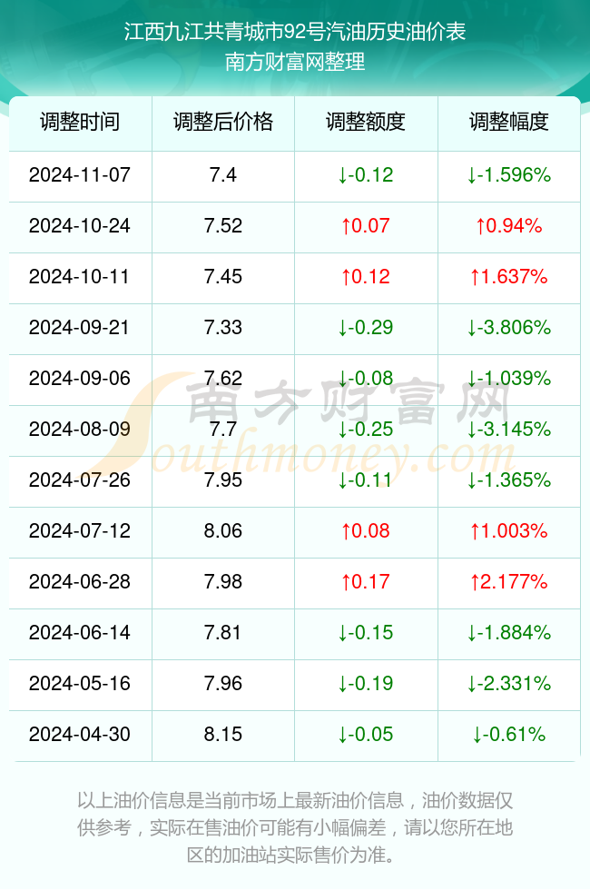 11月26日江西九江共青城市92号汽油的价格为7.4元/升,这是11月7日调整后的价格,相对上次调整时间10月24日的油价7.52元每升,下跌了0.12元,下跌幅达1.596%。