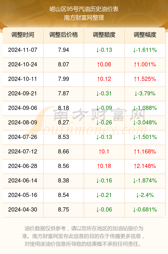 崂山区95号汽油历史油价表