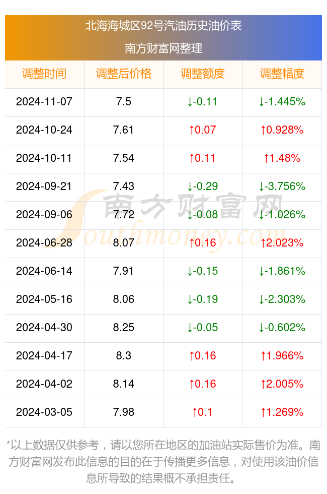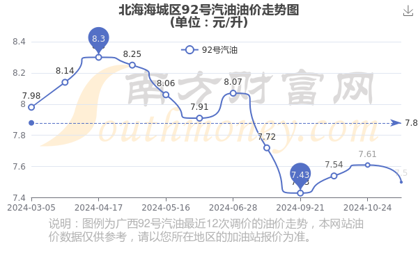 北海海城区92号汽油11月26日价格(11月7日调整后的价格):7.5元每升,对比上次调整(10月24日)的价格7.61元每升减了0.11元,减幅达1.445%。