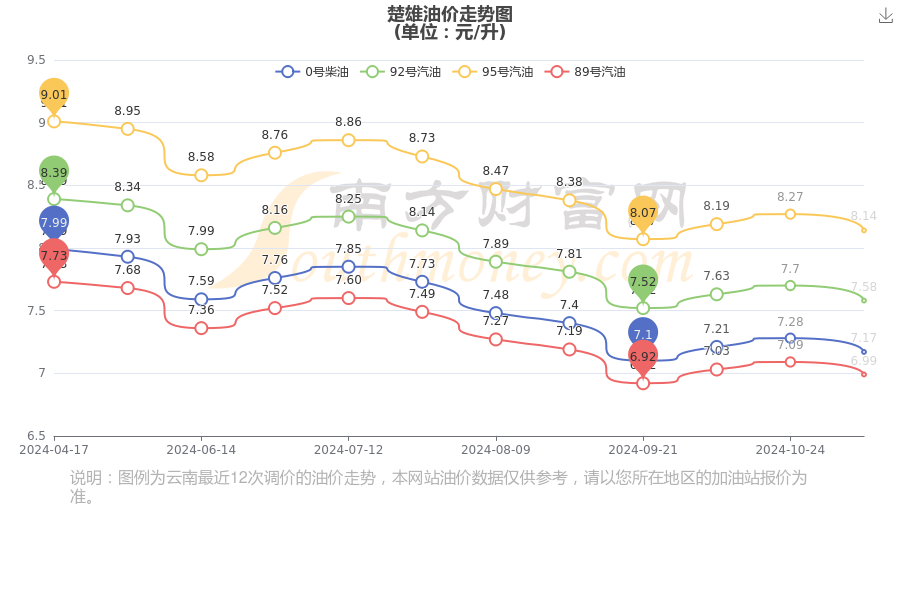 楚雄汽油、柴油11月26日每升最新价格:92号汽油为7.58元;95号汽油为8.14元;89号汽油为6.99元;0号柴油为7.17元,本轮油价调整时间为11月7日。