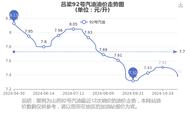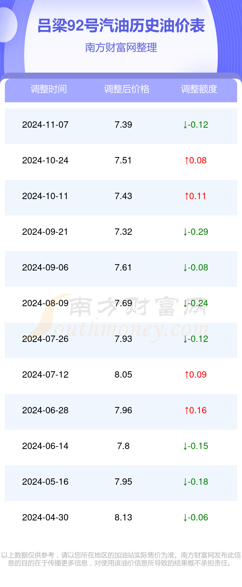11月26日吕梁92号汽油的价格是7.39元/升(调整时间为11月7日),对比上次调整时间10月24日的油价7.51元/升,降了0.12元,降幅达1.598%。