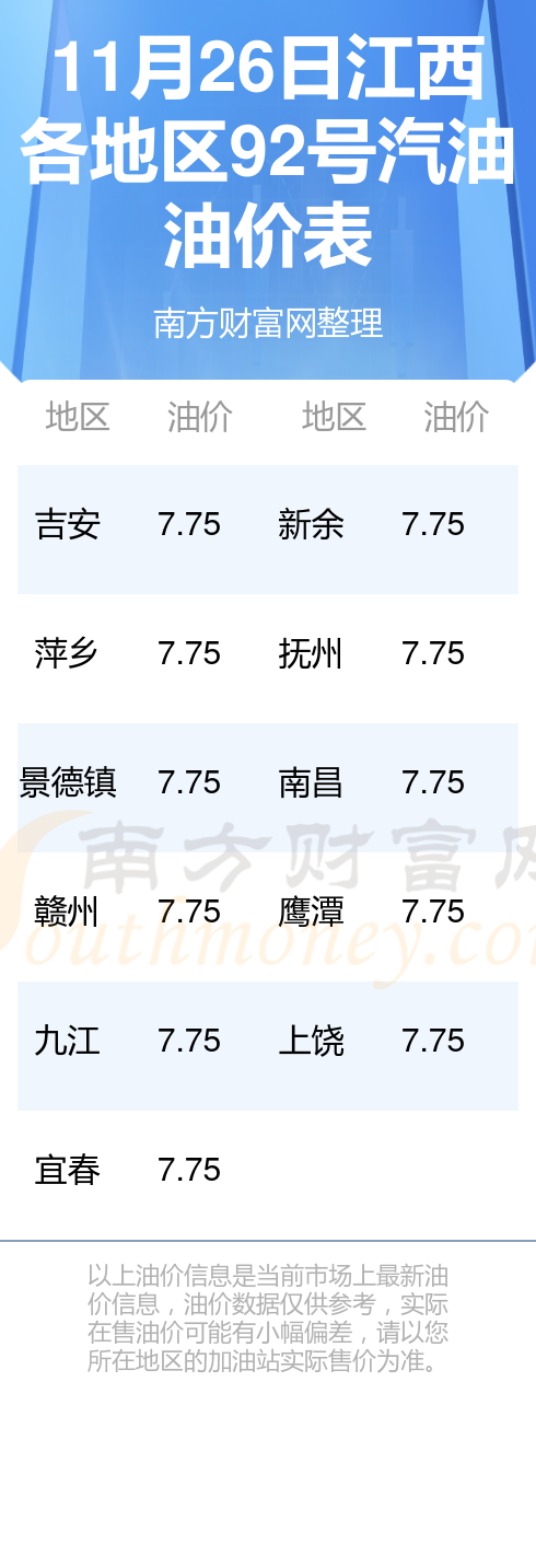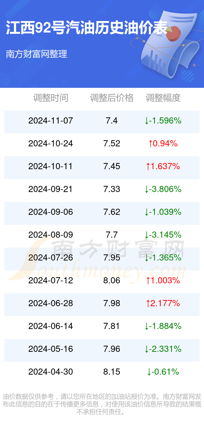11月26日,江西92号汽油的价格是7.4元每升,本次的调整时间为11月7日,对比上次的调整减了0.12元,减1.596%,12月2日24时为下一轮油价调整时间,还有7天。