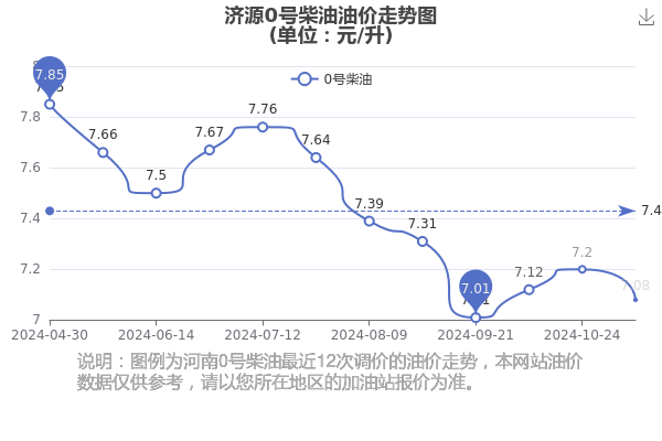 11月26日济源0号柴油的价格为11月7日油价调整后的价格,具体是每升7.08元,相对上次调整时间10月24日的油价7.2元每升,共跌了0.12元,跌1.667%。